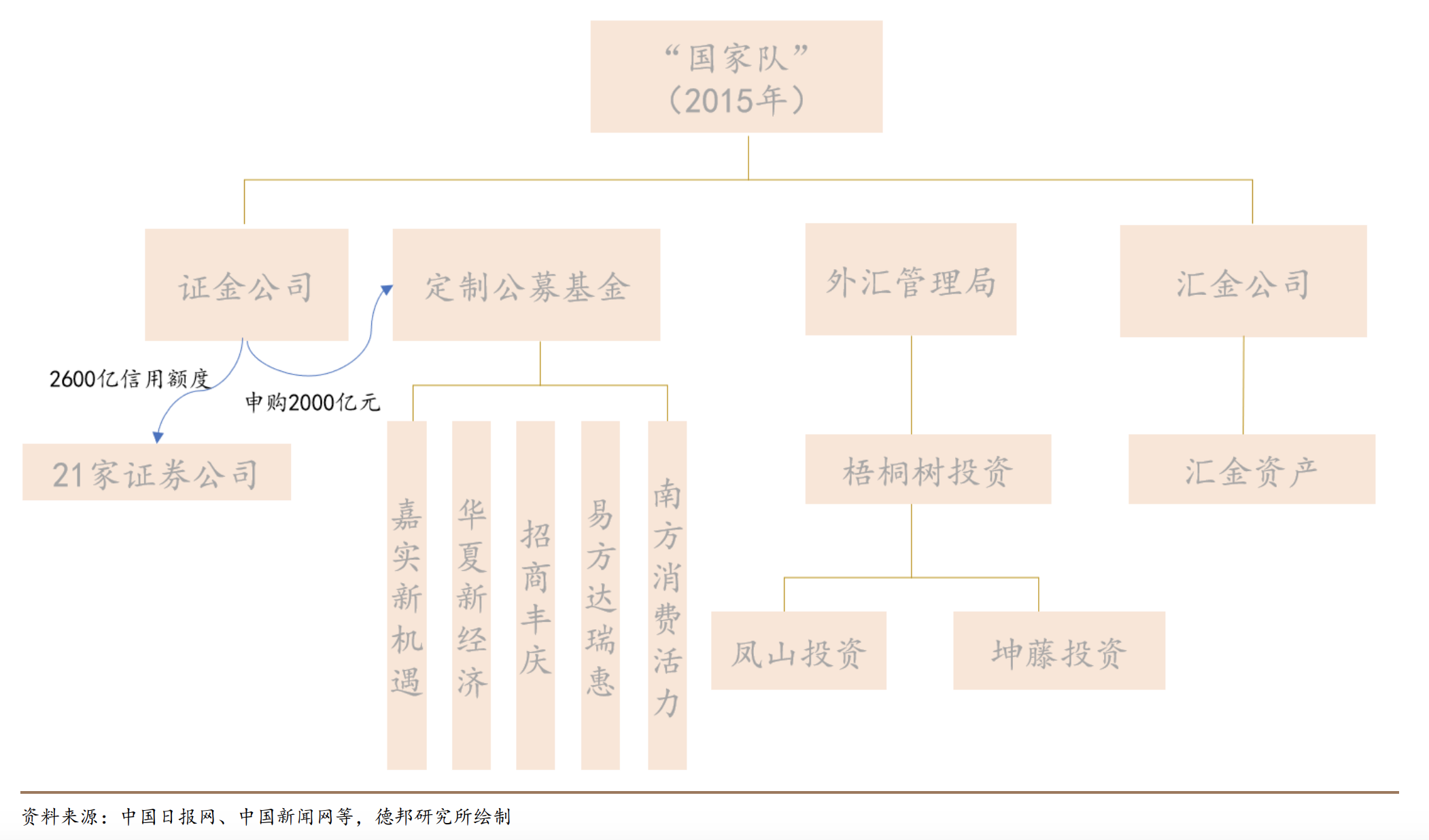 从2015年A股救市阶段看,彼时“国家队”资金主要包括三类机构资金。第一是汇金账户,包含中央汇金、中央汇金资产管理有限责任公司;第二是证金公司的11个账户及定制的10个资管计划;第三则是外管局下设完全控股的梧桐树投资平台,梧桐树又设两家公司均直接入市。