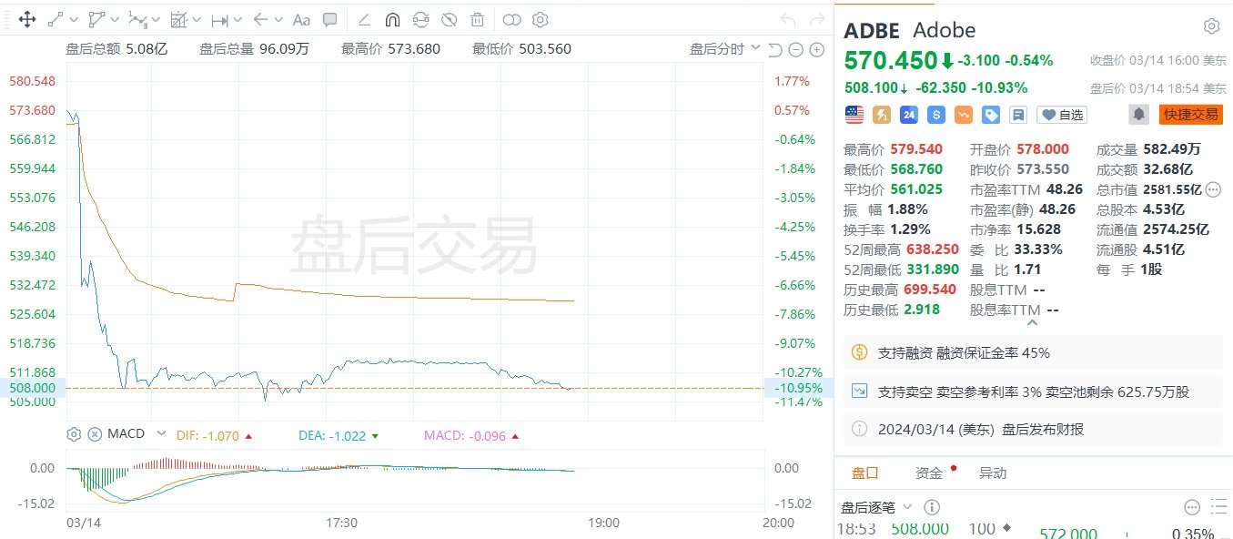 Adobe(奥多比)第一财季调整后每股收益为4.48美元,分析师预期4.38美元;第一财季营收51.8亿美元,分析师预期51.4亿美元;预计第二财季调整后每股收益为4.35-4.40美元,分析师预期4.38美元;预计第二财季营收52.5亿-53.0亿美元,分析师预期53.1亿美元;预计第二财季数字媒体营收38.7亿-39.0亿美元,分析师预期39.1亿美元;宣布250亿美元股票回购计划。Adobe美股盘后跌近11%。