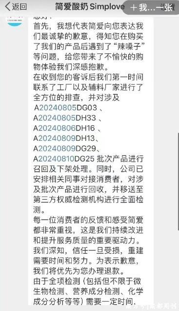 朱女士称,她购买的简爱酸奶是8月9日生产,保质期28天,并称她之前从来没有经历过这种症状,“以前充其量是上吐下泻,去厕所就好了,但是这次的症状好像是消毒水或是化学试剂进了你的体内”。朱女士当晚在社交平台看到有其他消费者反映跟她一样的症状,所购买的酸奶也是8月9号前后的批次。