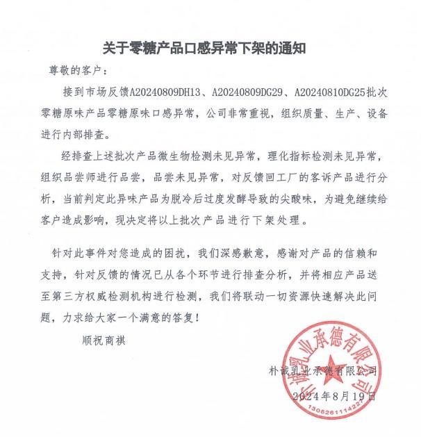 该通知显示,生产商朴诚乳业承德有限公司接到市场反馈A20240809DH13、A20240809DG29、A20240810DG25批次零糖原味产品零糖原味口感异常,公司非常重视,组织质量、生产、设备进行内部排查。朴诚乳业承德有限公司称,经排查,判定此异味产品为脱冷后过度发酵导致的尖酸味,为避免继续给客户造成影响,现决定将以上批次产品进行下架处理。