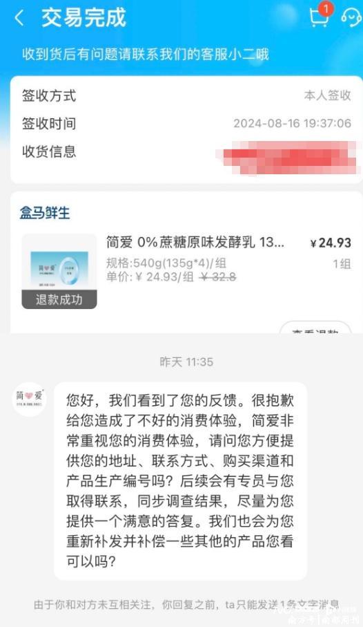 浙江的张女士告诉南都湾财社记者,她8月16日在盒马购买了简爱酸奶,8月18日饮用,喝的时候有异味,她本以为是包装盒味道,但她的对象喝了一口也表示有辣味,张女士称目前暂无其他不适。根据其提供的照片,她的这批次酸奶是8月9日生产,保质期25天,酸奶委托方为朴诚乳业(集团)有限公司,生产商为朴诚乳业承德有限公司。她表示,盒马已经给她退款了,她也找了简爱客服反馈并提供了材料,目前品牌方未向她做出解释。